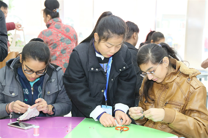 活动中心的活动大厅内同样十分热闹,一场以留学生为主角的荷包香囊手工活动正快乐展开。手工课上,五彩缤纷的丝线,精致小巧的女红用具让留学生们惊呼不可思议,大家学习劲头十足。“我来自江西省中医药大学,我来到中国已经两年啦!我在我们国家没见过这种香包,我们一起学做女红很有趣!”来自印度的留学生阿杜兴奋地告诉记者。传统女红深受留学生欢迎,活动现场处处洋溢着温馨氛围。