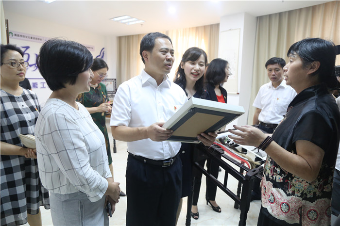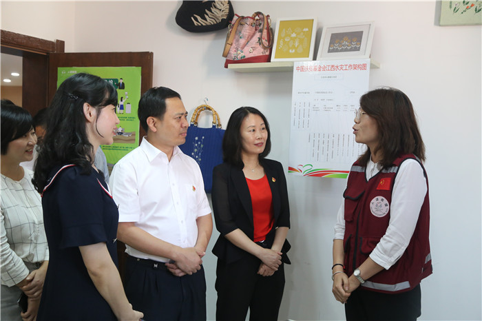 随后,严允一行走进省禁毒基地、“名著小书包”亲子阅读基地、崛美公益发展中心、巧娘部落、市家风馆,对项目公益运作等方面进行深入了解。在中心与崛美公益共同打造的“名著小书包”亲子阅读基地,教育扶贫、名著扶志的公益理念、专业化的阅读指导、智慧化的活动数据平台给大家留下深刻印象;在巧娘部落,“赣发绣”非遗技艺、巧娘课堂等吸引了大家的浓厚兴趣,对中心开展常态化女性手工培训予以肯定。