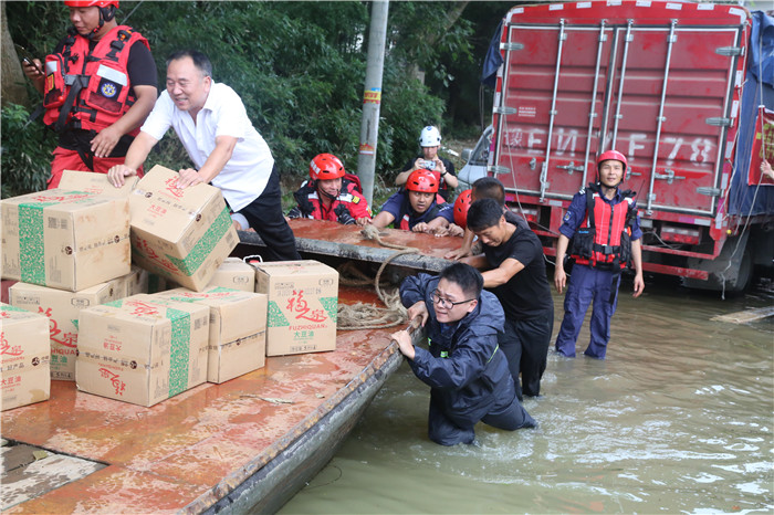 龙口村唯一出口积水深,道路窄,大型运输车辆掉头卸货困难,物资输送成为难题。来自全国各地的丽水消防、邓州救援、海豚救援、曙光救援等救援团队集结村口,中心的党员志愿者和救援团队一起为道路清障,搭建临时木桥,克服重重困难,装船,卸货,将一包包大米和食用油乘船送往居民家中。