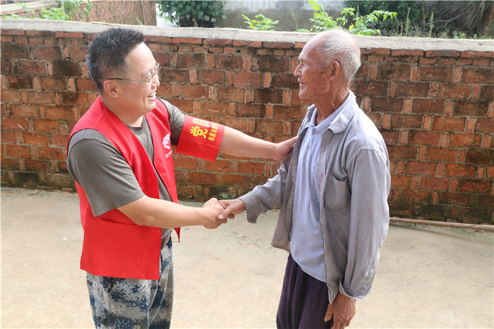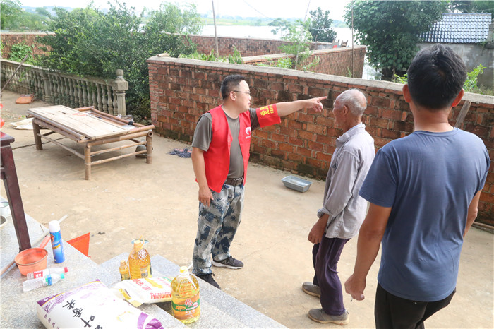 走访中,莲青村90岁高龄的石民进老人指着湖水远处一座只露出屋顶瓦片的房子说:“那个就是我住的房子”。老人带着一口方言,李茂克服语言的障碍,细心与老人交谈,询问老人的年龄、身体、家庭成员、受灾情况。老人的小儿子、儿媳腿有残疾,常年干不了重活,靠吃低保和地里种点菜过活,洪水过后,家里仅种下的小片菜地也被淹了,收入都没有了,只能靠政府和兄弟救济,非常感谢中心和工作小组对他们送去大米和油。