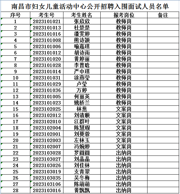 南昌市妇女儿童活动中心于2023年3月23日组织第一批公开招聘笔试,根据考生成绩情况,按照出纳成绩75分以上,教师岗、文案岗成绩80分以上划定入闱线。具体入闱面试名单如下:
