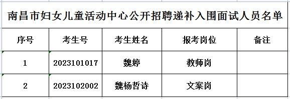 根据南昌市妇女儿童活动中心2023年度公开招考公告要求,由于考生自动放弃等因素,现按最终成绩由高到低分排名顺序进行递补,将递补入闱面试人员名单公布如下: