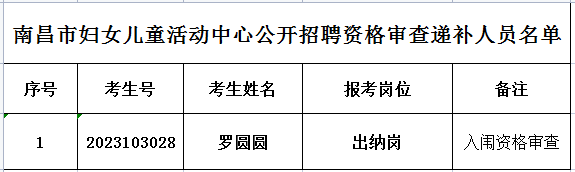根据南昌市妇女儿童活动中心2023年度公开招考公告要求,由于考生自动放弃等因素,现按最终成绩由高到低分排名顺序进行递补,将递补入闱人员名单公布如下: