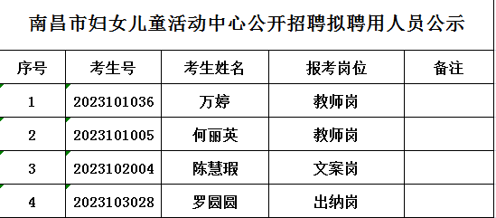根据《2023年南昌市妇女儿童活动中心招聘简章》要求,中心顺利组织开展公开招聘报名、笔试、面试、资格审查、体检等工作,现将拟聘人员予以公示。公示期自2023年4月5日至2023年4月9日。如对拟聘用人员有异议,请于公示期内实名反映,对匿名来电、来函等不予受理。