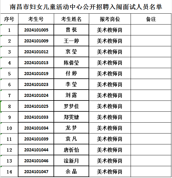 南昌市妇女儿童活动中心于2024年10月14日组织公开招聘人员笔试,根据考生成绩情况,美术教师岗按照笔试成绩75分以上划定入闱线。具体入闱面试名单如下: