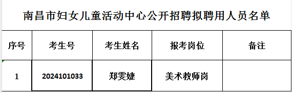 根据2024年南昌市妇女儿童活动中心公开招聘工作实施方案,中心顺利组织开展公开招聘报名、笔试、面试、资格审查、体检等工作,现将拟聘人员予以公示。公示期自2024年10月30日至2024年11月3日。如对拟聘用人员有异议,请于公示期内实名反映,对匿名来电、来函等不予受理。