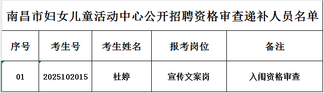南昌市妇女儿童活动中心于2025年4月顺利完成社会人员招聘笔试、面试、资格审查、体检、公示等工作,预录取教师岗、宣传文案岗各1名。现因宣传文案岗预录取人员个人放弃入职,按照原定招聘方案及计划,按照笔试面试综合成绩依次递补,现将资格审查递补人员名单公布如下: