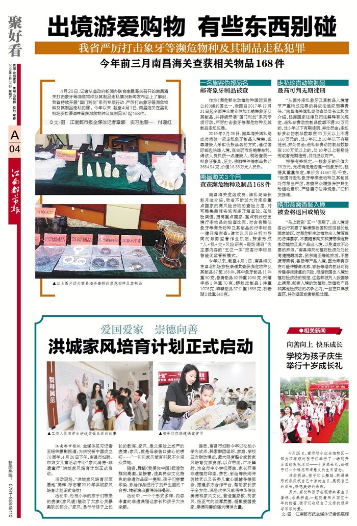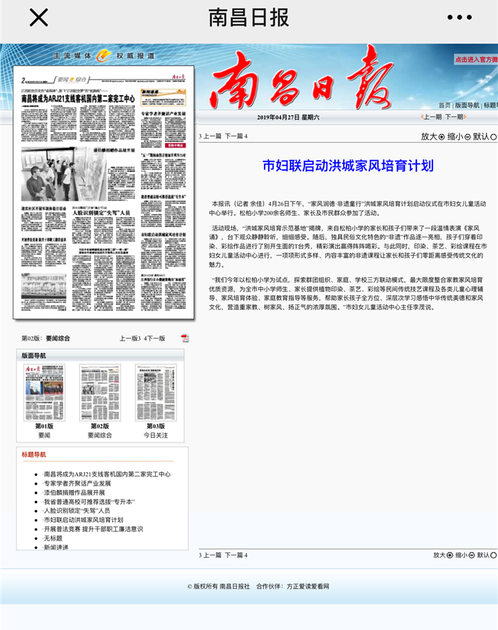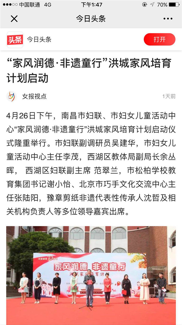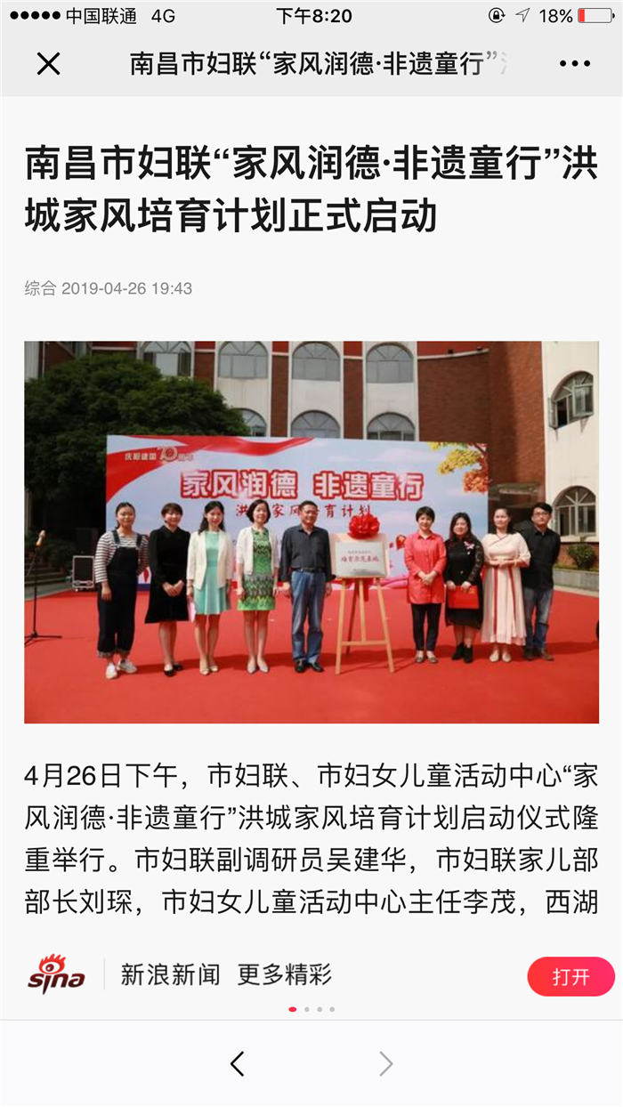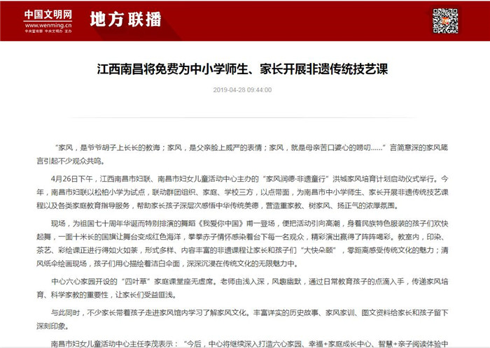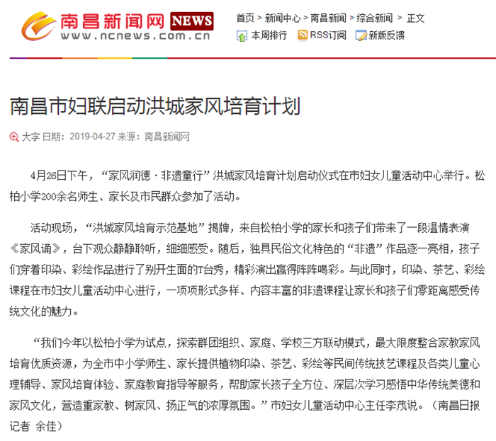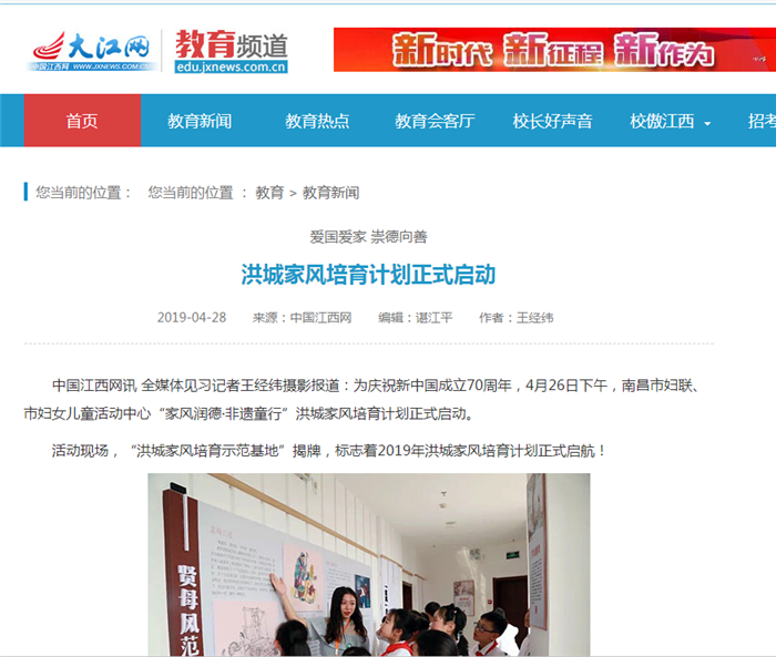 4月26日,《江西妇女报》以《”家风润德·非遗童行”洪城家风培育计划启动》为题,报道了由南昌市妇联主办,南昌市妇女儿童活动中心承办的”家风润德·非遗童行”洪城家风培育计划启动活动。此次活动旨在聚家校合力,探索家庭教育、家风培育的新模式,让和合家风吹进学校、社区、千万家庭,为建设温馨幸福家庭、促进社会和谐文明贡献力量。