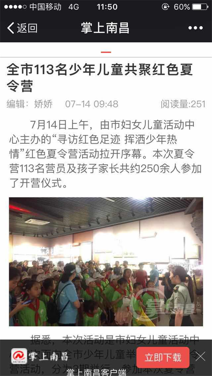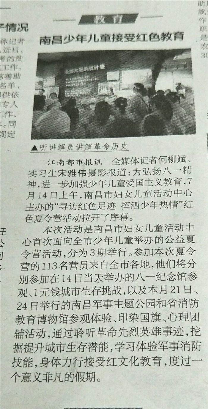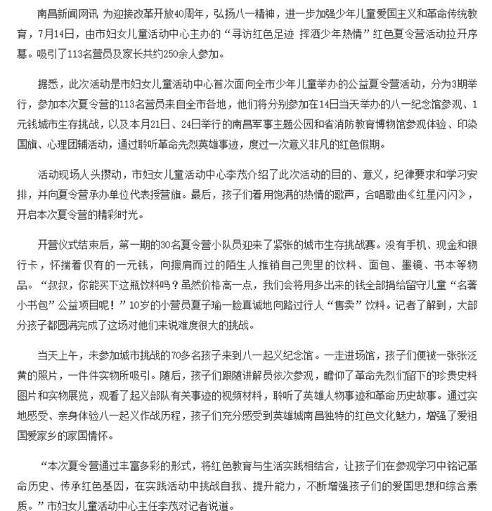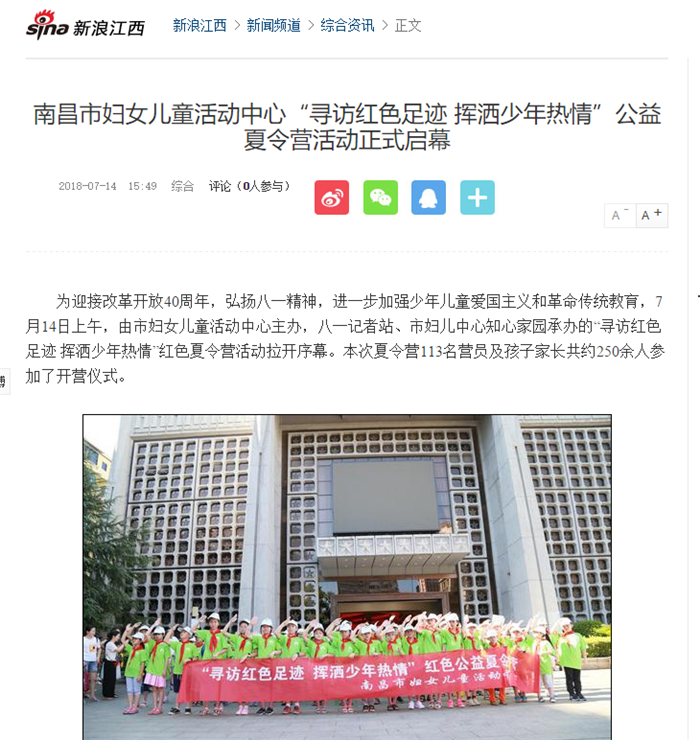 为迎接改革开放40周年,弘扬八一精神,进一步加强少年儿童爱国主义和革命传统教育,7月14日上午,由市妇女儿童活动中心主办,八一记者站、市妇儿中心知心家园承办的“寻访红色足迹 挥洒少年热情”红色夏令营活动拉开序幕。本次夏令营113名营员及孩子家长共约250余人参加了开营仪式。