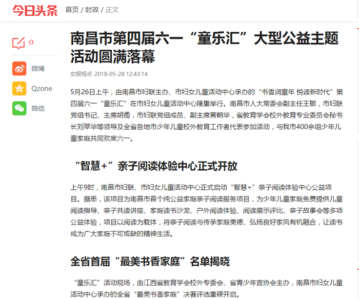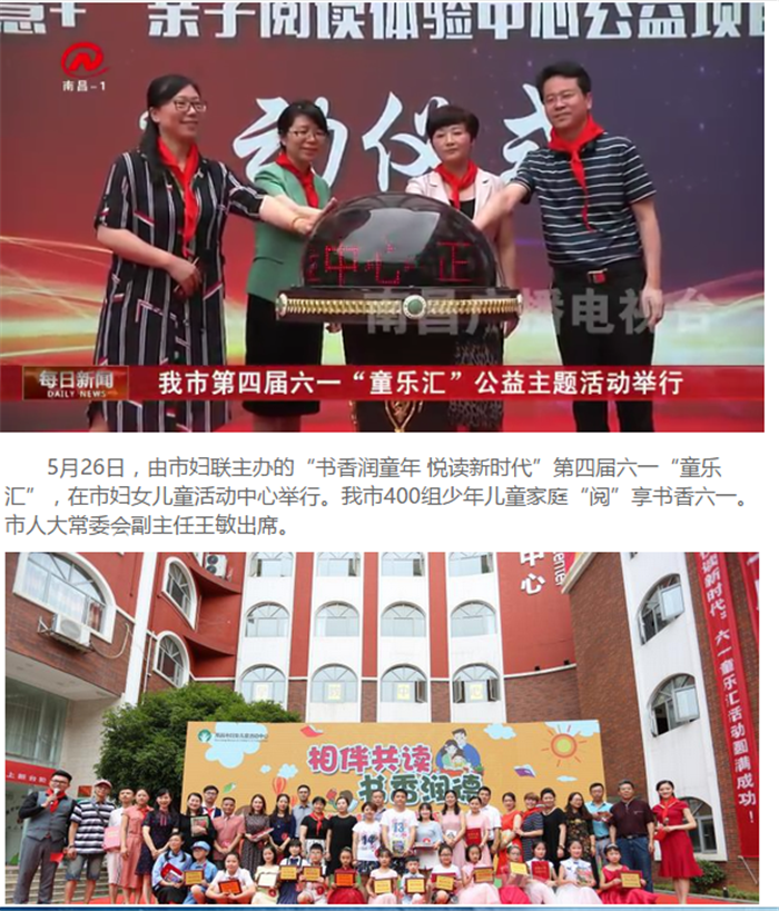 5月26日上午,由南昌市妇联主办、市妇女儿童活动中心承办的“书香润童年 悦读新时代”第四届六一“童乐汇”在市妇女儿童活动中心隆重举行。市人大常委会党组成员、副主任王敏,市妇联党组书记、主席胡矞,市妇联党组成员、副主席黄朝华,省教育学会校外教育专业委员会秘书长刘翠华等领导及全省各地市少年儿童校外教育工作者代表参加活动,与我市400余组少年儿童家庭共同欢度六一。